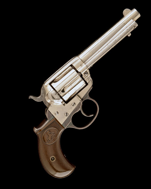for 1893 (grip frame later), with tapering plated 4 1/2in. barrel, the top signed 'COLT'S PT. F.A. MFG CO. HARTFORD, CT. U.S.A.', crescent fore-sight, sighting groove to the top-strap, fluted cylinder, plated solid frame with side loading gate, blued grip-straps and trigger-guard, finely chequered hard-rubber birdshead grips embossed with the Colt trademark, side-mounted ejector-rod, the whole retaining a fair amount of factory finish