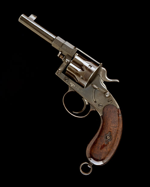 German, dated for 1893, with triple-stage 4 3/4in. barrel, wedge fore-sight, standing-notch rear-sight, cylinder with 'church-window' flutes, plain frame with side-safety, loading gate to right hand side, smooth walnut bag-shaped grips, lanyard ring at pommel, the back-strap stamped '19 R.A. 5. 84.'.