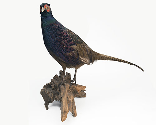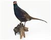 A FULL-MOUNT OF A MELANISTIC COCK PHEASANT,