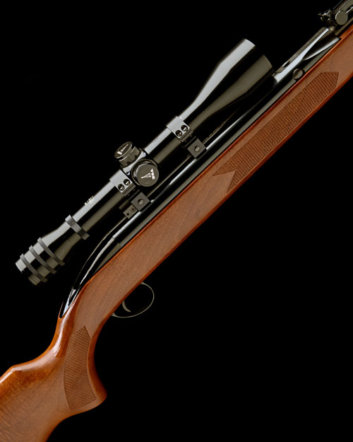 one of one thousand rifles made to celebrate the 100th anniversary of BSA in 1982, with blued 19 1/2in. barrel, ramp fore-sight, micro-adjustable rear-sight, tap-action loading, the air-chamber marked 'BSA PILED ARMS CENTENARY ONE OF ONE THOUSAND', special edition chequered walnut three-quarter stock with raised comb and cheek-piece, pistol-grip capped with special 'BSA piled arms' cover, ventilated rubber recoil pad, rosewood schnabel fore-end tip, the whole appearing little used; TOGETHER WITH its original issue 'BSA' 4x40 telescopic sight and mounts, its original limited edition certificate papers and original vinyl gunbag, the whole contained within the original makers carton