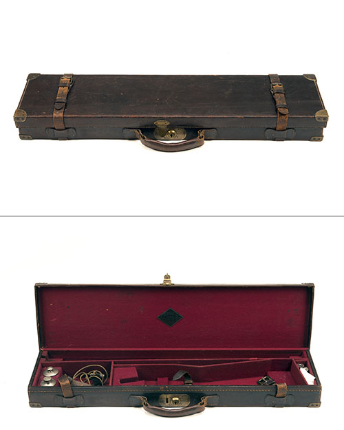 fitted for 29in. barrels, the interior lined with maroon baize, brass (key missing), two vintage oil bottle, a pair of 12-bore snap caps and a cleaning rod