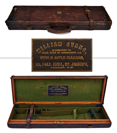 fitted for 28in. barrels, the interior lined with green baize (some repairs), with a gold-tooled leather William Evans trade label, brass lock (needs attention), one strap missing