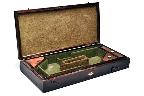 A MAHOGANY CASE FOR A PAIR OF FLINTLOCK DUELLING PISTOLS,