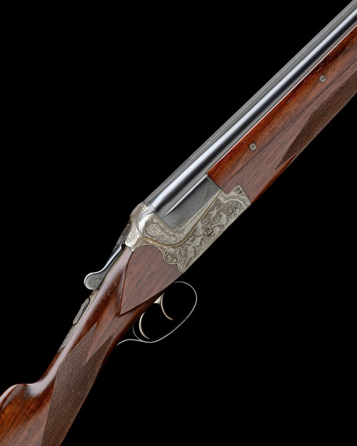 28in. nitro reproved barrels with 8mm solid matt top-rib, 2 3/4in. chambers, bored approx. bored approx. 1/4 and 1/2 choke, three-piece fore-end, bolstered scroll-back action, hold-open toplever, automatic safety, articulated front trigger, acanthus scroll engraving surrounding carved vignettes of a hound flushing feather from the undergrowth on the left, the right with a covey of partridge in their naturalistic habitat, 14 5/8in. stock including buttplate, weight 6lb. 14oz.