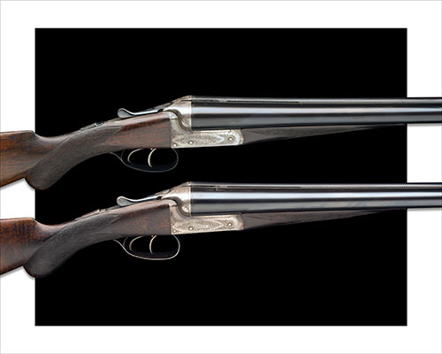 30in. nitro reproved barrels, the ribs engraved 'J.V. NEEDHAM. LOVEDAY STREET. BIRMINGHAM.' and engraved '1' and '2' at the breech ends, 2 1/2in. chambers, bored approx. true cyl. and 3/4 choke (No.1) true cyl. and 1/2 choke (No.2), treble-grip actions, automatic safeties, border and partial scroll engraving, retaining traces of original colour-hardening and finish, 15 3/4in. slightly-figured semi-pistolgrip stocks including 1in. wooden extensions, weight 7lb. both)