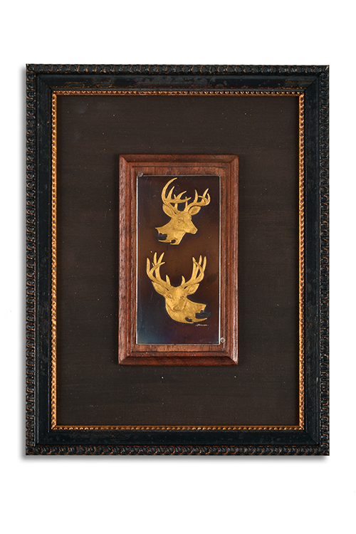 J.M. DEBRUS A FRAMED AND MOUNTED BLUED STEEL PLAQUE FINELY ENGRAVED AND 24 CARAT GOLD-INLAID WITH TWO PORTRAITS OF WHITETAIL DEER,