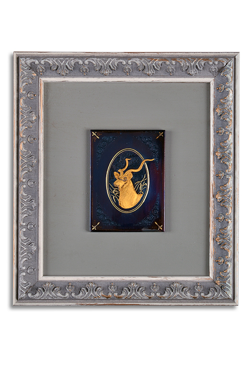 A FRAMED AND MOUNTED BLUED STEEL PLAQUE FINELY ENGRAVED AND 24 CARAT GOLD-INLAID WITH A VIGNETTE OF A KUDU,