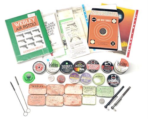 spanning the 1930's to the present day and including six '500' size orange rectangular tins for WEBLEY .22 SPECIAL PELLETS, a similar tin in pale green for '1000 WEBLEY .177 SPECIAL PELLETS', two smaller examples of '500' size, a scarce round tin in pale green for the same pellets, an assortment of later tins including brand-names 'FLYING SCOT', 'LAZADOME', 'LAZAPELL', 'LAZAPOINT', 'WAISTED', 'HUSTLER' and 'GRAND PRIX', an unopened box of targets circa 1970, two cleaning brushes, two .22 barrels probably from Premier models and a copy of Gordon Bruce's book 'WEBLEY AIR PISTOLS', together with some photocopied and original parts lists, adverts etc. (qty)