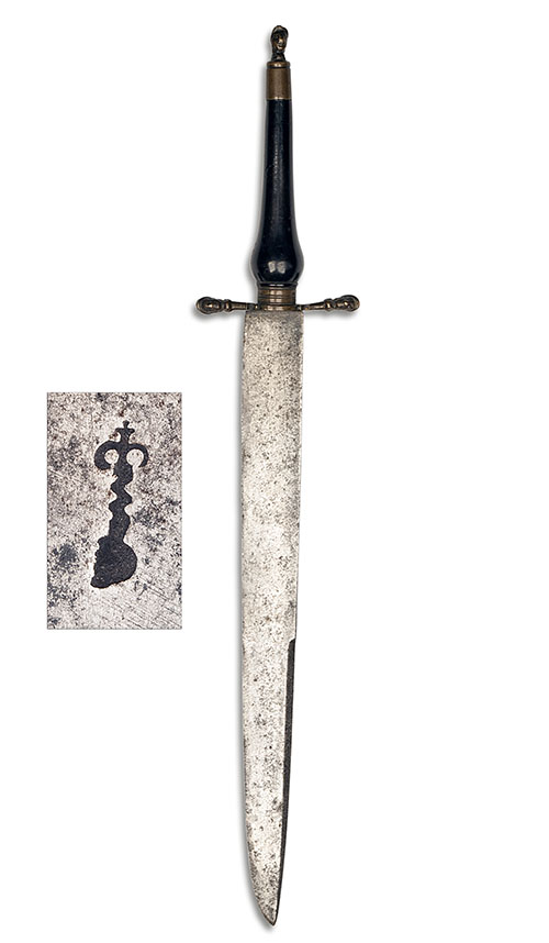 probably French or English circa 1690, with 13in. clip-point blade false edged for the last 6in. (patchy dark staining), deeply struck makers mark of a flambé sword cutting a rock to the left hand side, moulded brass cross-guard with quillions formed as helmeted male heads, tapering hardwood grip swelling to the fore, tapering brass pommel-cap with helmeted male head finial, no scabbard