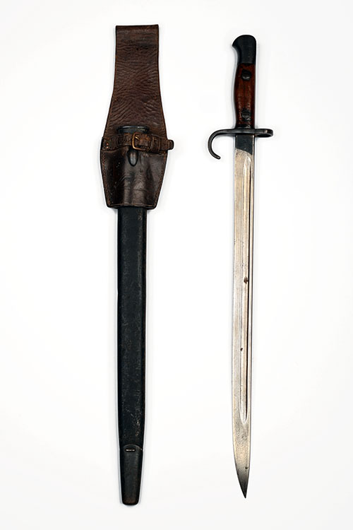 dated for 1907, with 17in. polished spear-point blade, blind fuller for the majority of its length, the blued forte stamped with a King's crown over 'E.R.' above '1907' above '10-08' above 'EFD' for Enfield, the reverse with various inspectors stamps, blued cross-guard with hooked quillion, wood scales and blued pommel, the right side of pommel stamped 'W. RID' over 'R.437', complete with its original leather scabbard with iron mounts and a pattern '03 leather frog