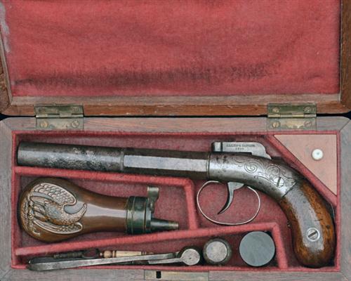 circa 1848, with 5in. two-stage rifled barrel, engraved coin-edged band at the intersection and breech, the top-flat signed 'ALLEN THURBER & CO', scroll engraved rounded boxlock action, central double-action only hammer marked 'ALLEN'S PATENT 1845', smooth walnut bag-shaped grips, decorated back-strap and replacement trigger-guard bow; TOGETHER WITH a period but probably unassociated walnut case, the lid lined in red satin, the tray compartmented and lined in red baize and containing the pistol along with a possibly period 'Colt' priming flask, a scissors ball mould, a pewter oil bottle and a wooden cap-pot