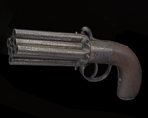 Belgian, circa 1850, with eight 4 1/2in. plain turn-off barrels (mostly frozen) numbered individually from '1' through '8' and set in an square formation, correspondingly numbered rotating standing breech with radial nipples, keyed muzzles, round section plain boxlock action, flush-fitting hammer body with raised spurless head, the top-tang marked 'J.J.H. BREVETE', replacement smooth walnut bag-shaped butt, sliding iron pommel-cap revealing a well for caps, iron trigger-guard bow and double action only trigger