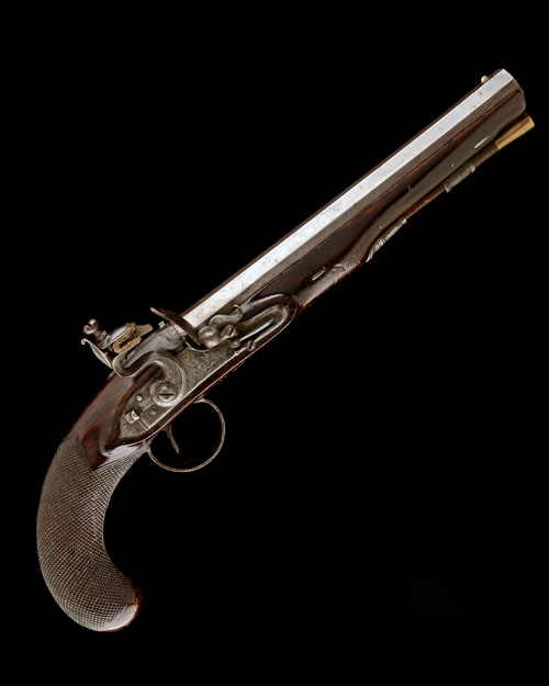 circa 1790 and in the duelling style, with slightly swamped re-browned 9in. barrel, the top-flat signed 'LONDON', applied silver fore-sight, engraved band at breech, engraved top-tang with standing notch rear-sight, silver-lined touch-hole, slightly curved, flat, bevel-edged lock with stepped tail signed forwards of the hammer 'JACKSON', sliding safe behind the hammer, semi-rainproof pan, roller bearing to the frizzen-spring, walnut full-stock with chequered bag-shaped grip, iron furniture including pineapple finial, twin plain iron barrel-keys and brass-tipped mahogany ramrod with worm end