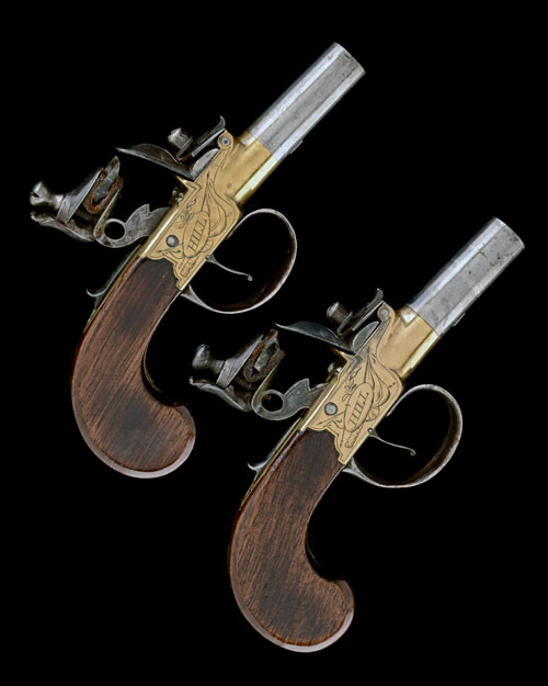 HILL, LONDON A PAIR OF 54-BORE FLINTLOCK BRASS-BODIED BOXLOCK POCKET-PISTOLS, no visible serial numbers,
