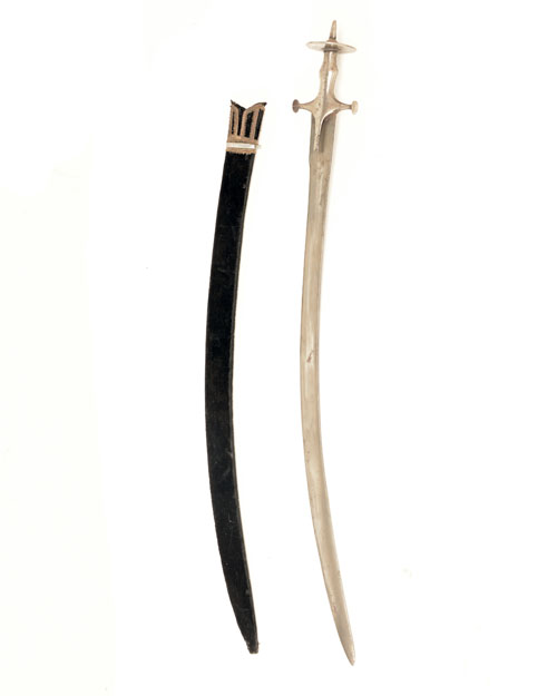 AN INDIAN TULWAR SWORD WITH WATERED BLADE, early 19th century, with curved 33in. blade widening at the tip (cleaned, loss to watered detail), plated iron hilt of typical form with circular terminals to the straight quillions and long langets, disc pommel with spiked finial and swollen centre to the grip-piece; TOGETHER WITH a later black velvet covered wood scabbard with braided trim at throat and along back seam