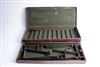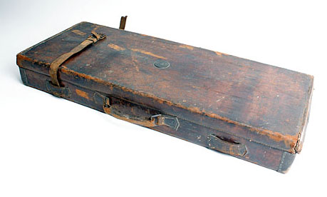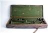 A TWO-TIER DOUBLE HAMMERGUN CASE, fitted for 29in. barrels, the interior lined with green baize, brass lock (key missing)