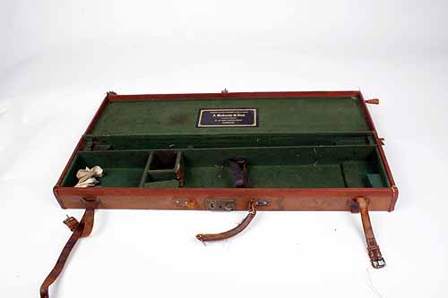 A CANVAS AND LEATHER SINGLE GUNCASE, fitted for 28in. barrels, the interior lined with green baize, with a J. Roberts & Son trade label, brass lock (key missing), handle needs attention