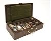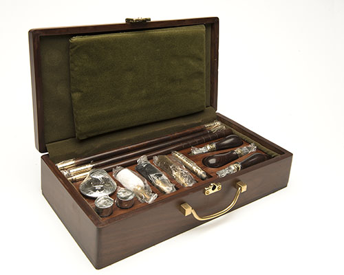 fitted partitioned tray with separate compartments containing three turnscrews, three-piece cleaning rod, heads, nickel-plated oil bottle and snap-caps, case lined with green baize, brass lock (including key),