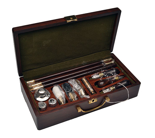 fitted partitioned tray with separate compartments containing three turnscrews, three-piece cleaning rod, heads, nickel-plated oil bottle and snap-caps, case lined with green baize, brass lock (including key), brass fittings