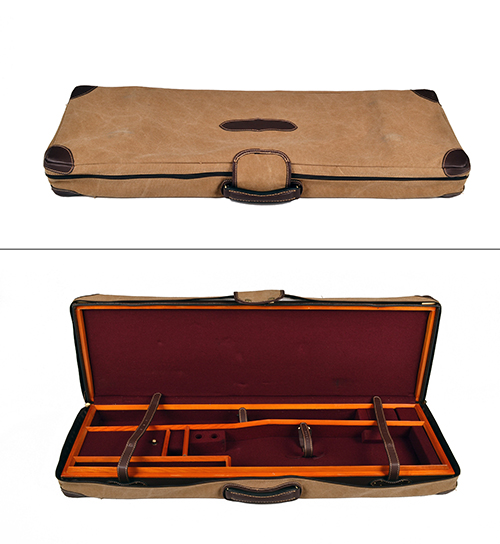 fitted for 33in. barrels (with four block spacers), the interior lined with maroon baize, brass lock (key missing), canvas outer