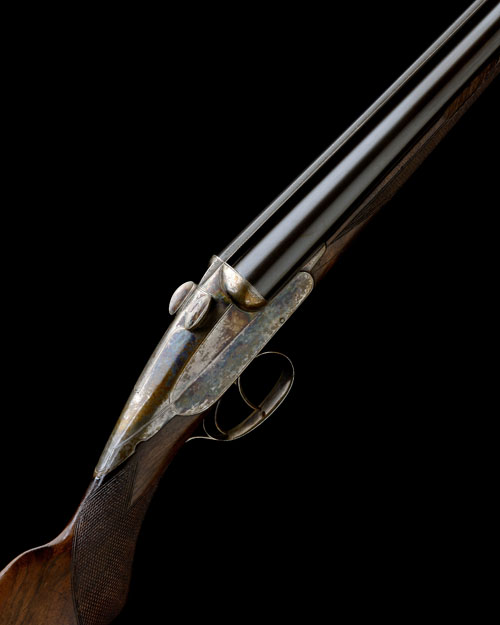 26in. nitro barrels with ten 'flower' stamps, raised matt rib, 3 1/4in. chambers, bored approx. imp. cyl. and 1/4 choke, push button barrel release, ten flower stamped sliding breech action, border engraving, retaining some original colour-hardening, 15in. figured semi-pistolgrip stock, weight 6lb. 8oz.