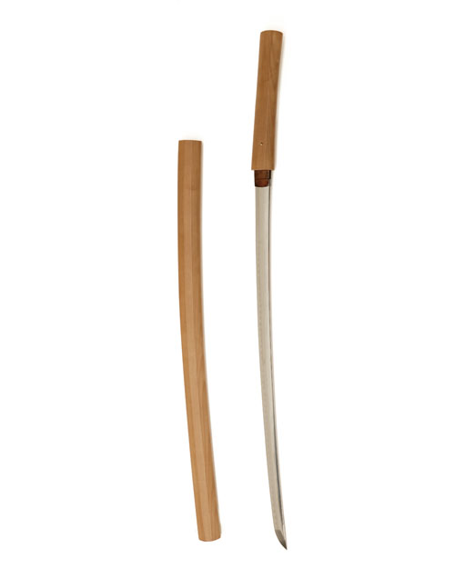 A JAPANESE KATANA IN A SHIRASAYA, THE TANG SIGNED 'BINGO MIYOSHIJU TAMURA MASAYUKI SAKU' 18th century, with 25 1/2in. blade (re-polished), prominent hamon, copper 'habaki', two 'mekugi-ana', with a later shirasaya and silk sword-bag