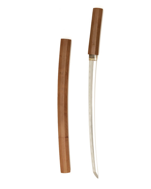 late 18th to early 19th century, with 17 1/2in. blade, prominent 'hamon' (repolished), silver-gilt 'habaki', single 'mekugi-ana', in a later shirasaya with silk sword-bag
