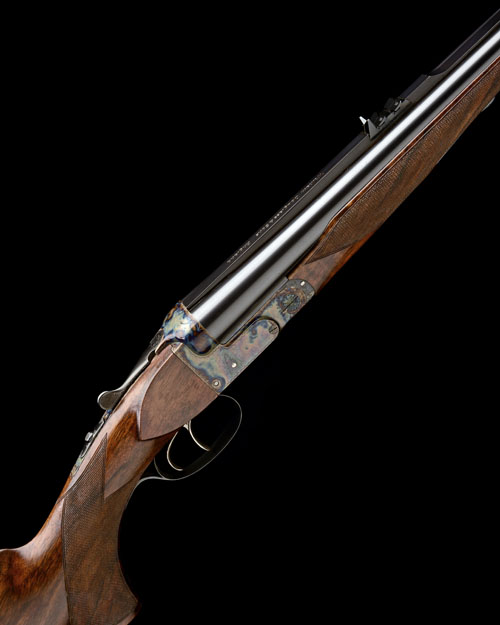 23 1/2in. nitro barrels (London proof 1996) with sight rib engraved 'WILLIAM DOUGLASS & SONS. ENGLAND.', open sights and folding leaf sights for 100 and 200 yards, ramp-mounted bead foresight, stepped treble-grip action with removable striker discs, manual safety, border engraving, the underside engraved 'WILLIAM DOUGLASS & SONS. LONDON.', retaining virtually full original colour-hardening and finish, 15in. well-figured pistolgrip stock including 7/8in. rubber recoil pad, semi-beavertail fore-end with grip-catch release, weight 10lb. 13oz.