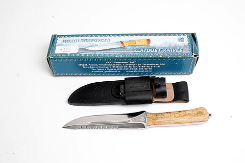 A ZLATOUST HUNTING KNIFE, with a clip point back serrated stainless steel blade measuring 6 1/2 in. secured with brass pins to a light wooden handle TOGETHER with leather belt sheath and makers carton