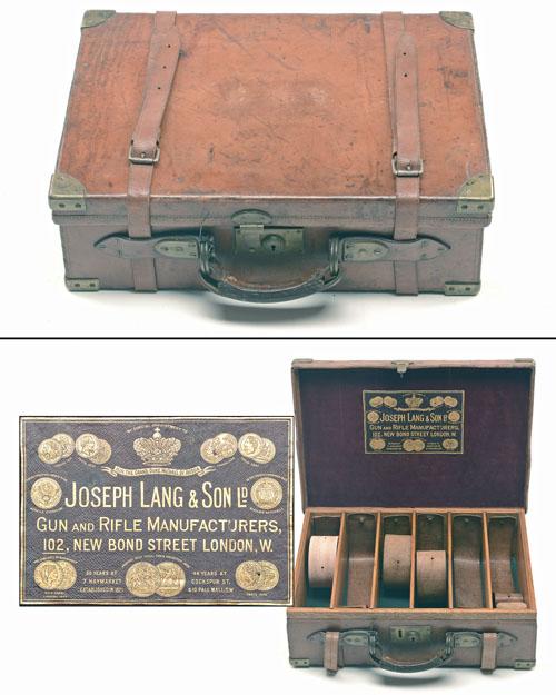 for approx. 400 cartridges, maroon baize-lined lid interior with a red leather gold tooled Joseph Lang & Son trade label, five oak dividers, six leather lifters, brass lock (including key),