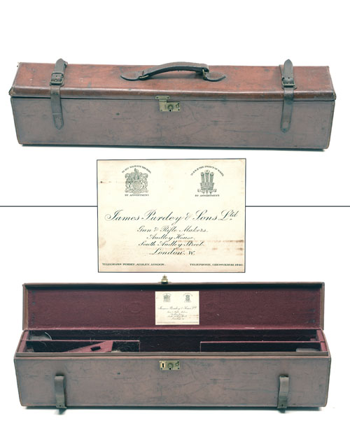 fitted for 30in. barrels, the interior lined with maroon baize with a James Purdey & Sons trade label, brass lock (including key), the lid exterior with the monogram 'S.B.'