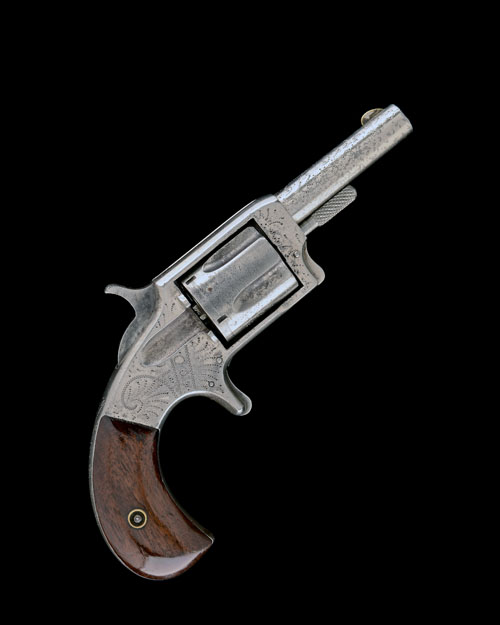 circa 1880, with round 2 1/2in. barrel, the top-strap with model designation and 'PAT MAY 28 1876', fluted cylinder, solid frame, walnut birdshead grips and sheathed trigger, the whole with extensive 'dot' type engraving forming geometric shapes and patterns, brushed bright finish throughout