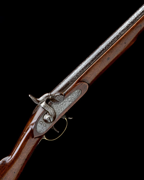 dated for 1858, with 27in. barrel (stained externally), block fore-sight, no provision for rear-sight, solid rounded top-tang, borderline engraved bar-action lock dated only, walnut three-quarter stock, brass furniture, provision for sling with iron stirrup swivel to the fore-end and replaced iron ramrod