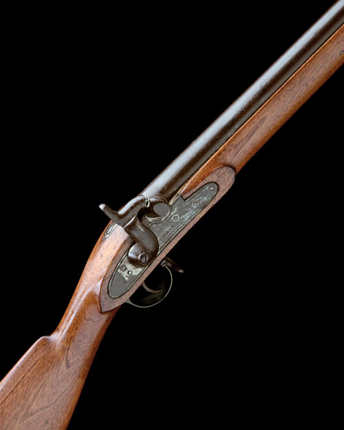 probably produced for export circa 1845, with 39in. barrel, boat-shaped fore-sight, no provision for rear-sight, borderline engraved lock signed 'TOWER', with a Victorian type crown stamped to tail, walnut full-stock (refreshed) with shallow raised cheek-piece, the right hand side of butt stamped within an oval 'COOPER & GOODMAN MAKERS BIRM.M', brass furniture, stirrup swivels, replacement ramrod