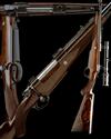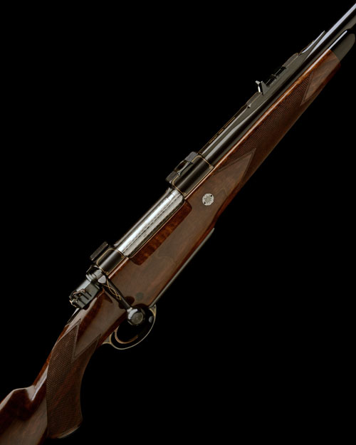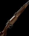 24 1/8in. nitro barrel, sight rib with chequerboard engraving, open sights with two folding leaf sights, gold line detailing and gold-inlaid with the makers name, serial number and calibre designation, ramp-mounted bead fore-sight with flip-up moonsight, protective hood and with further gold line details, plain blued receiver with solid side wall, gold line details and mounted with a Swarovski 1,25-4x24 Habicht telescopic sight in quickly-detachable mounts, bolt handle with gold line detailing and chequered oval panels and central floral design, florally-engraved recoil blocks, hinged straddle floorplate with push button release, plain blued and gold line finish, highly-figured pistolgrip stock with cheekpiece, engraved blued steel pistolgrip-cap with gold line and monogram details, 14 1/2in. pull including 1in. leather covered recoil pad