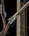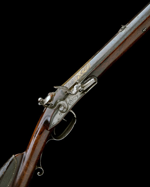 French, circa 1800, with 35in. swamped octagonal barrel rifled with twelve grooves and retaining much original blued finish, the barrel decorated at the muzzle, mid-section and breech-end with gilt panels of incised foliage, rear-sight with one standing and one folding leaf, gold-lined touch-hole, foliate engraved tang, rounded border engraved lock signed 'A PARIS', figured walnut full stock with leather-covered pad to the comb, 'hog's bristle' set triggers, engraved iron mounts including scrolled trigger-guard with urn finial and rounded side-plate, iron sling mounts, and iron ramrod (some discolouration to lock and mounts).