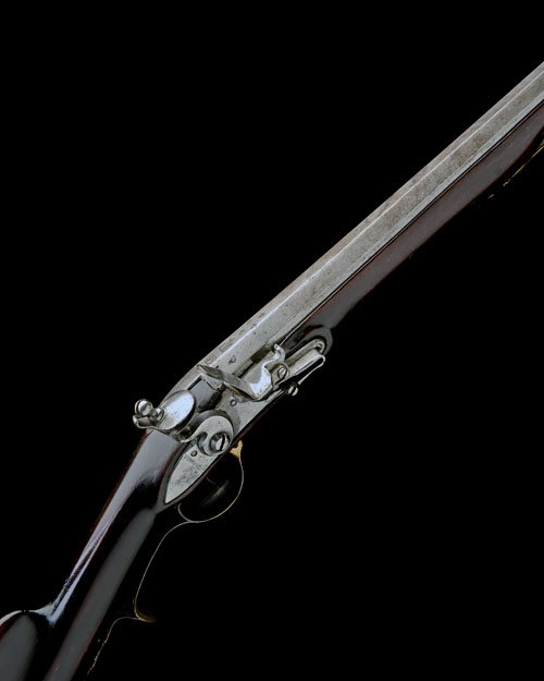 circa 1790, with slightly shortened 30 3/4in. swamped octagonal barrel with straight-groove rifling and struck at the breech with 'Spanish' marks, silver spider fore-sight, relined touch-hole, flat bevelled lock, later full stock with horn fore-end cap, brass mounts including butt-plate decorated in low relief with rococo ornament and a classical soldier on the tang, iron sling mounts and horn-tipped ramrod (fore-end replaced, iron parts cleaned)