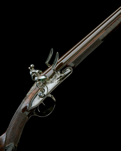 circa 1795, with slightly shortened 33 1/4in. octagonal to round sighted barrels with faded plum-coloured finish, silver-covered border engraved grooved tang, polished rounded border engraved locks respectively signed 'DECHANDON' and 'A ST. ETIENNE', well figured half-stock with raised cheek-piece, chequered grip and fore-end, carved in relief with a mask behind the grip and a dragon behind the cheek-piece, silver mounts including associated butt-plate with sprung hinged trap-cover moulded trigger-guard and ramrod throat, iron sling mounts, later bone-capped ramrod (some minor surface corrosion marking to locks, stock with insert repairs to fore-end and grip, chequering refreshed).