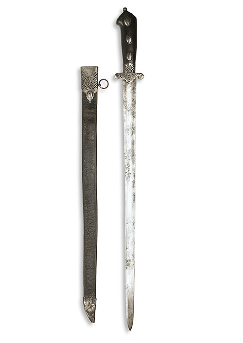 A CONTINENTAL HUNTING HANGER, PROBABLY FRENCH, late 18th century, with 22 1/4in. fullered single-edged spear-point blade, iron hilt with small guard with short scrolled quillons and decorated with hatched lines surrounding a flower, collar pierced with trellis-work, hatched grip-strap, button finial, and hardwood grip-scales each set with three iron roundels, in leather scabbard with iron locket pierced with further trellis-work (some pitting to blade, some wear throughout, chape replaced, scabbard leather warped).