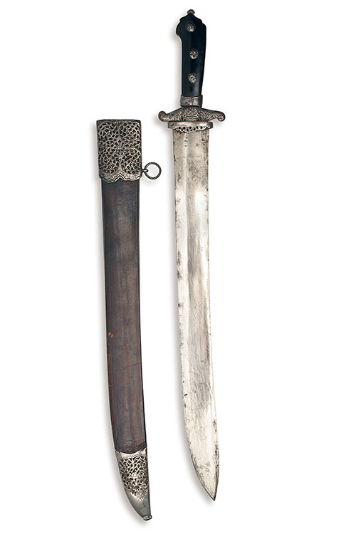 early 19th century, with wide 21 1/2in. single-edged fullered spear-point blade, iron hilt with pierced guard and quillon-block, short quillons with scrolled finials, hardwood grip-scales each set with three iron rosettes, in original brown leather scabbard with iron locket and chape each with pierced scrollwork (some wear and light staining to blade).