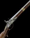 Austrian, circa 1800, with 39 3/4in. two-stage sighted barrel etched with a damascus twist pattern and struck at the breech with maker's marks, flat bevelled lock signed 'AUGUSTIN SCHOFL IN WEIN' and engraved with scrollwork and a vignette of a mounted huntsman with a hound and a flight of ducks, walnut half-stock with raised cheek-piece, engraved gilded brass mounts, wooden trigger-guard and later wooden ramrod.