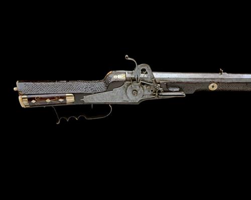 dated '1621' but probably late Georgian or early Victorian, with 35 1/2in. swamped octagonal sighted barrel, plain lock (hammer spring fractured but present), walnut full stock (cracked through and repaired on the fore-end, patchbox-cover a probable replacement), stock with bone inlay and later ramrod.