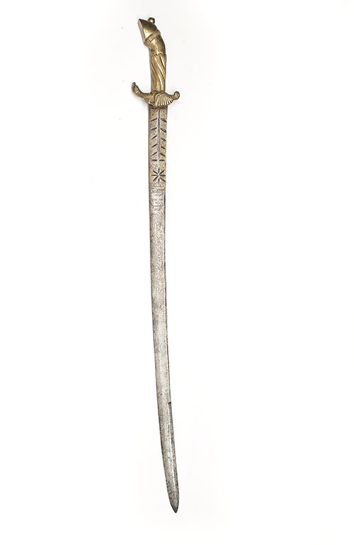 A FRENCH HUNTING HANGER WITH BRASS HILT, late 18th century, with 25 1/4in. slightly curved single-edged blade with engraved and etched decoration and the Latin inscription 'QUIS SEPARET NOS NIL NISI MORS' heightened with gilding on each side, gilt-brass hilt in the form of a hoof (blade discoloured), missing scabbard