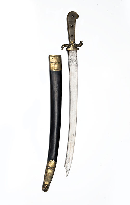 A CONTINENTAL HUNTING HANGER, PROBABLY FRENCH, early 19th century, with etched damask 20 1/2in. slightly curved single-edged clip-point 'T' profile blade further etched at the ricasso with an eastern trophy of arms on one side and a figure of a Turkish sultan on the other, brass hilt with short vertically recurved quillons with dog's head finials, light horn grip-scales, and brass-mounted scabbard with dogs-head frog-button
