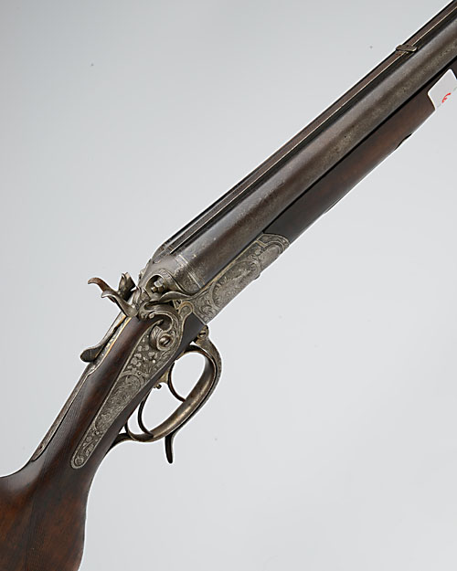THE STOCK, ACTION AND FORE-END ONLY OF A 16-BORE / 9MM PUSH-FORWARD UNDERLEVER DRILLING, no visible serial number, push-forward underlever (spring at fault), carved percussion fences, toplever barrel selector, set front trigger, bold foliate engraving with game scenes of hound and stag, fowl and roe, 14in. semi-pistolgrip stock with cheekpiece, damaged at toe, action welded at knuckle