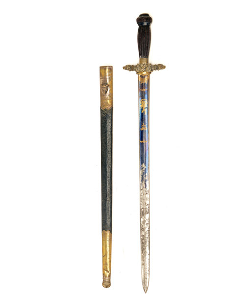 French, 19th century, with 23 1/4in. double-edged spear-point fullered blade etched with gilt trophies against a blued ground for half its length (rubbed), cast and chased brass guard with dog's head finials to the short straight quillons and guard with boar's head trophy, swelled fluted wood grip, in original brass-mounted leather scabbard (some discolouration and pitting).
