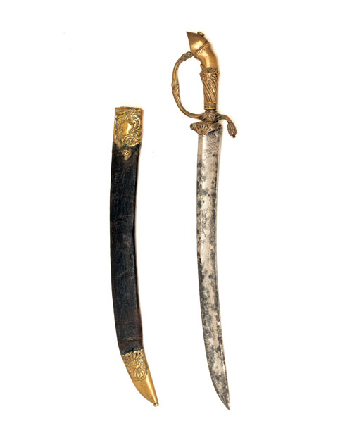 A FRENCH HUNTING HANGER, 19th century, with 16 1/4in. curved fullered spear-point blade (pitted), brass hilt cast and chased with rococo ornament, the pommel in the form of a hoof, in original brass-mounted leather scabbard en suite with the hilt.