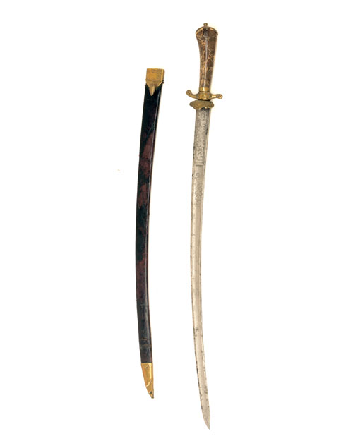 A CONTINENTAL HUNTING HANGER, 19th century, with 23in. curved single-edged clip-point fullered blade etched with scrollwork and game scenes on each side, brass hilt with small downturned shell guard, stained bone grip (old cracks), brass pommel, in original brass-mounted vellum-covered scabbard.