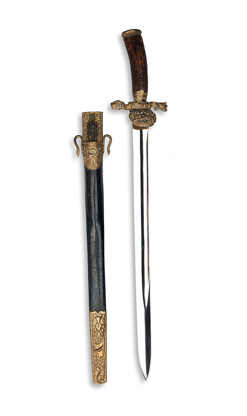 late 19th century, with 17in. single-edged plated fullered spear-point blade, brass hilt with downturned shell guard decorated in relief with a running stag, hunting horn trophies and scrollwork (traces of gilding), short quillons respectively with lion- and lioness-head finials, natural staghorn grip, brass pommel, and original brass-mounted leather scabbard with extra stag-handled knife.