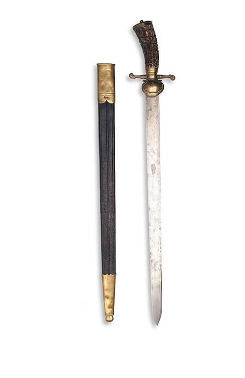 19th century, with single-edged 22 1/2in. spear-point blade, brass hilt with downturned shell guard, wire-bound natural staghorn grip, in a brass-mounted leather scabbard.